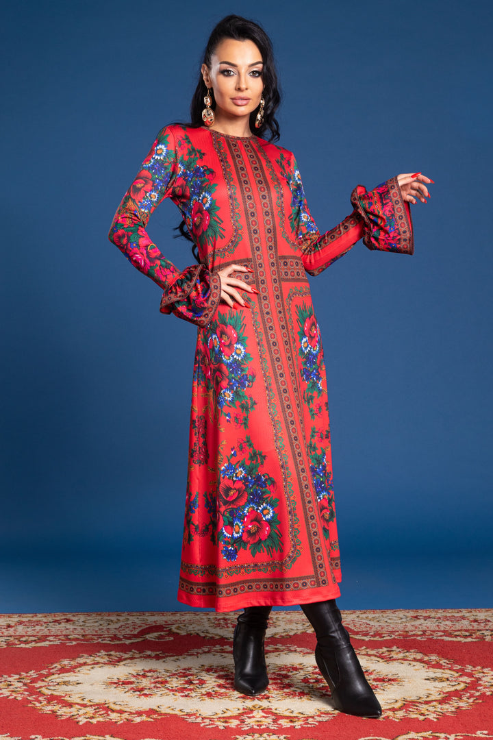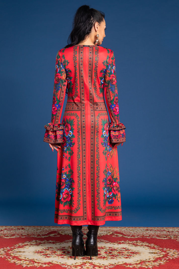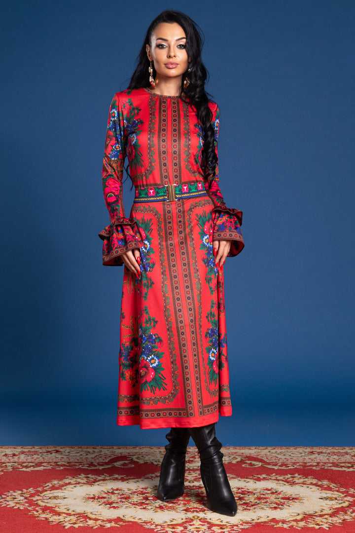 Long-sleeved, mid-calf-length, form-fitting dress. Closed round neck with folded straps. Skirt part is flared "A" line. Bottom of sleeves are decorated with ruffles. Back