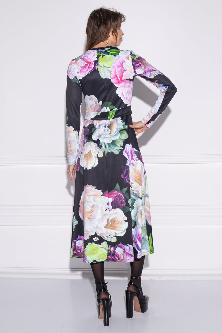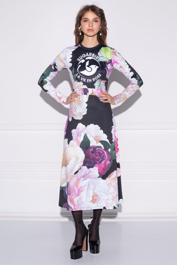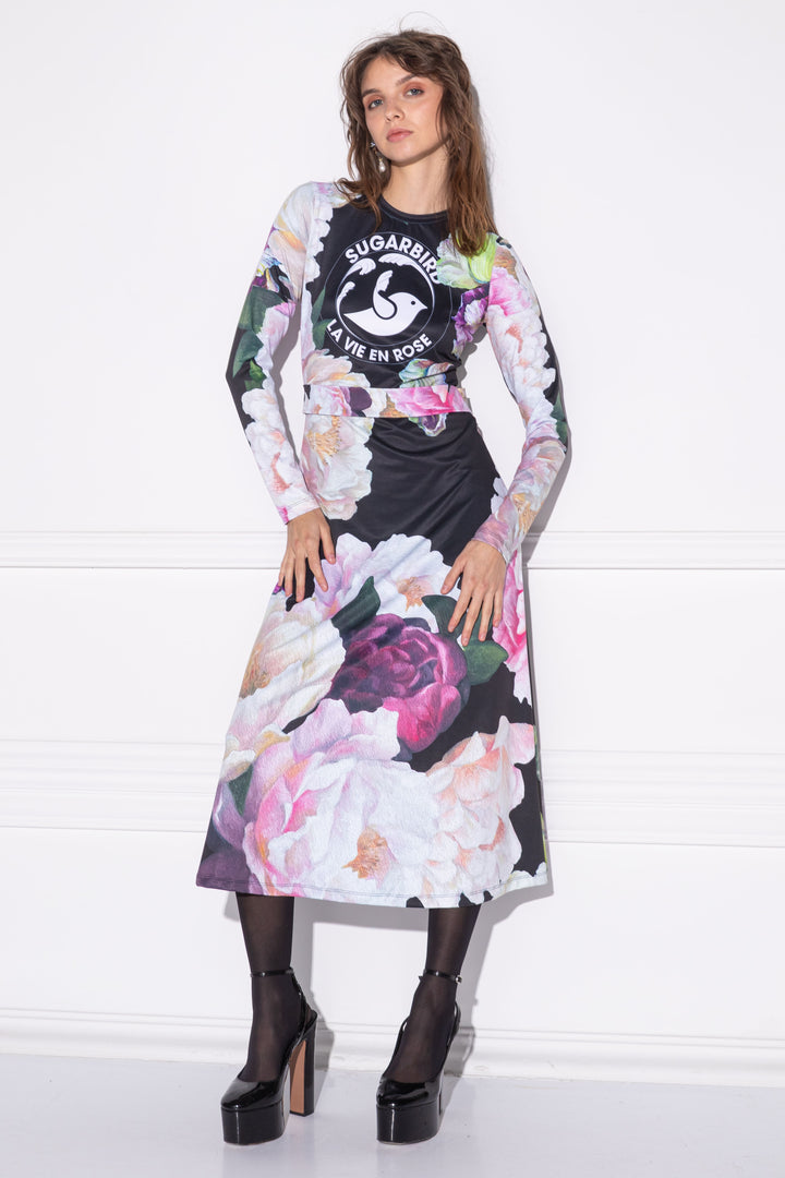 Long-sleeved, mid-calf-length, form-fitting dress. Closed round neck with folded straps. Skirt part is flared "A" line. Belted at the waist. Back SUGARBIRD We sewed a label with the inscription.
