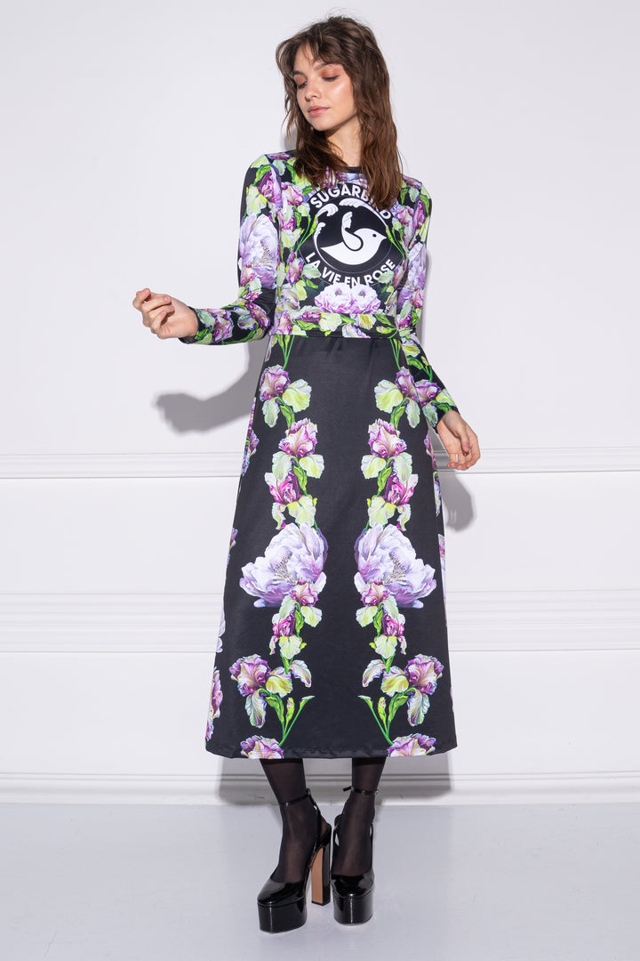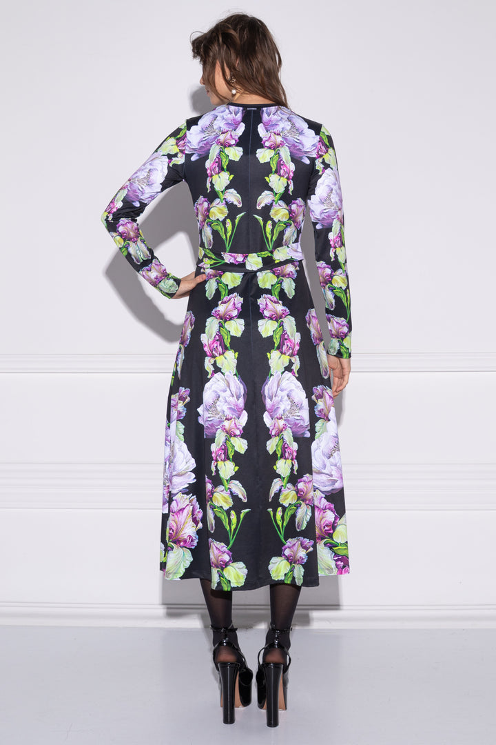 Long-sleeved, mid-calf-length, form-fitting dress. Closed round neck with folded straps. Skirt part is flared "A" line. Belted at the waist. Back