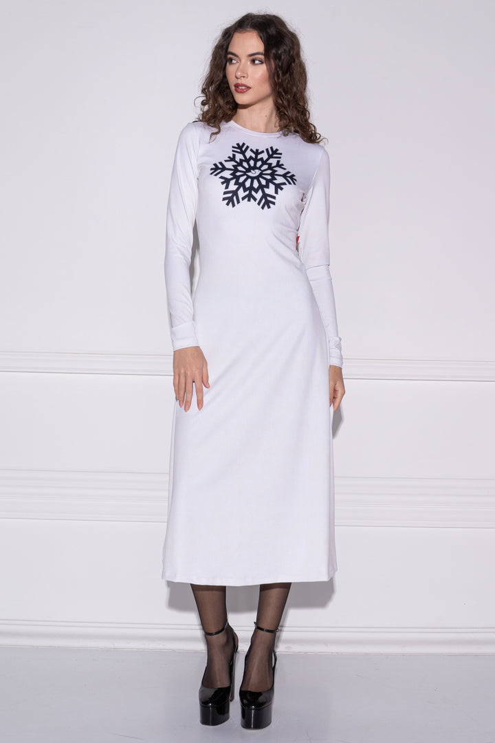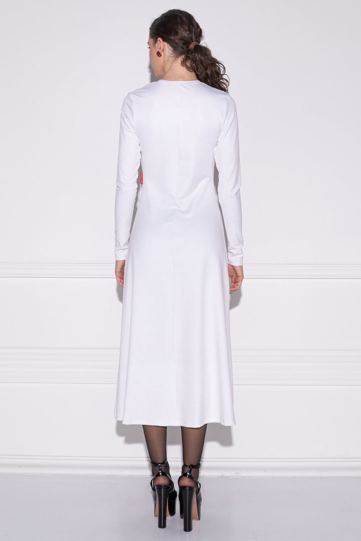 Long-sleeved, mid-calf-length, form-fitting dress. Closed round neck with folded straps. Skirt part is flared A-line. The style is SUGARBIRD decorated with a label.