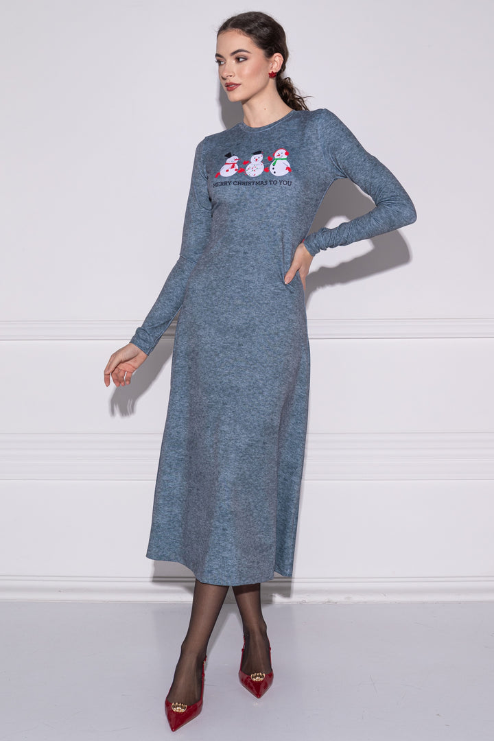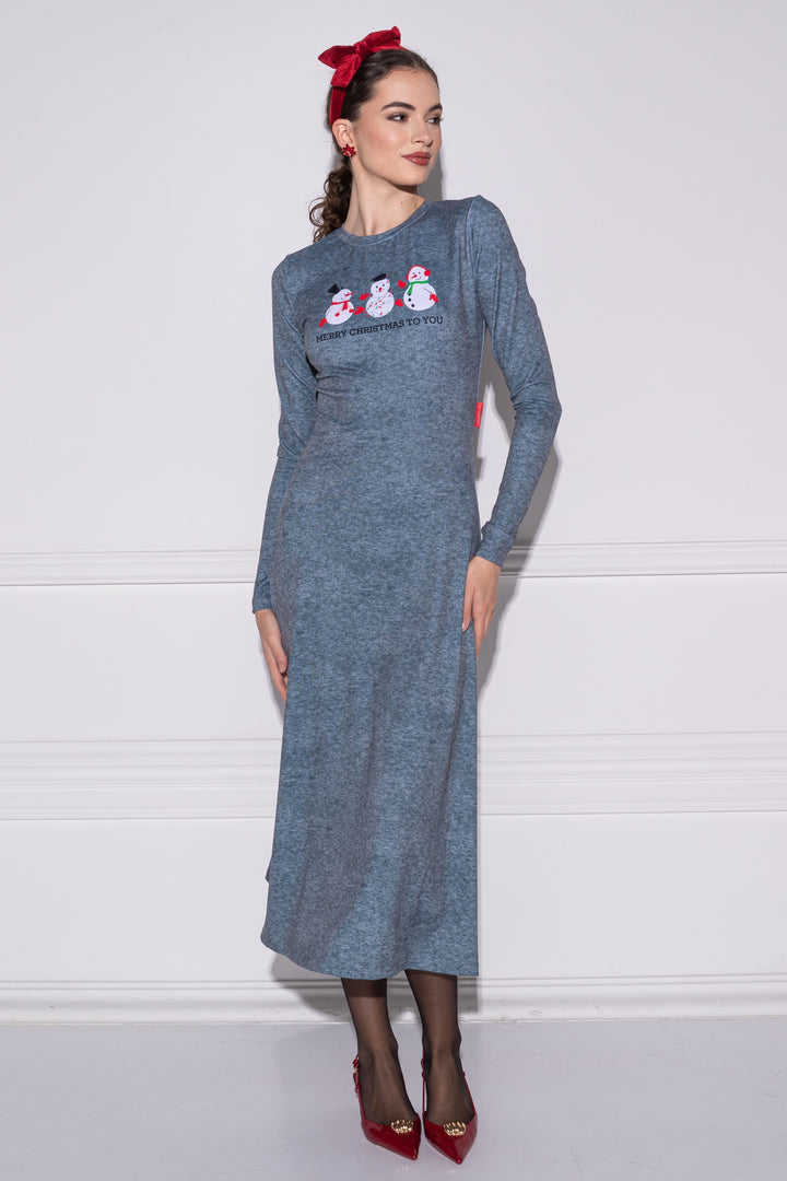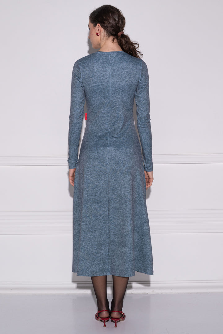 Long-sleeved, mid-calf-length, form-fitting dress. Closed round neck with folded straps. Skirt part is flared A-line. The style is SUGARBIRD decorated with a label.