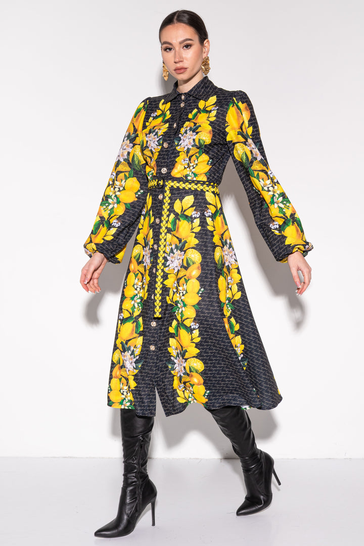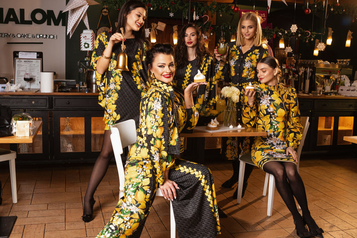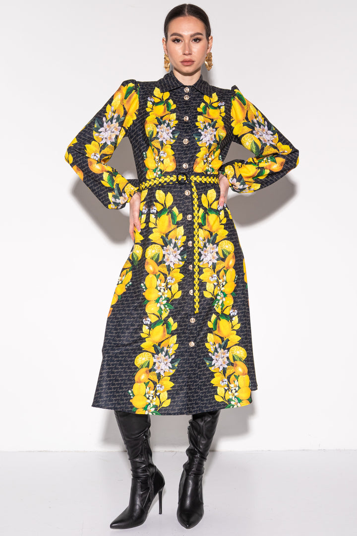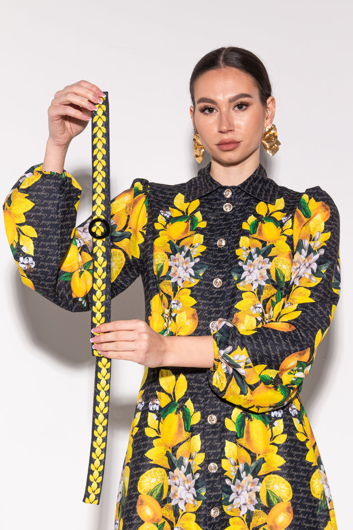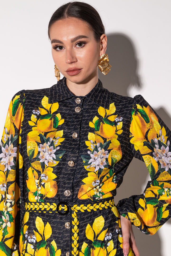 Update your wardrobe with our latest collection. Get your favorite style, with a pattern on a dark background. SUGARBIRD It is decorated with inscriptions and printed graphics of lemons, leaves and their flowers.