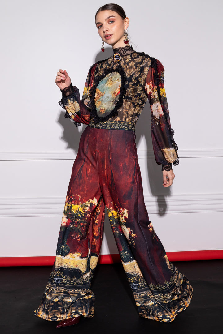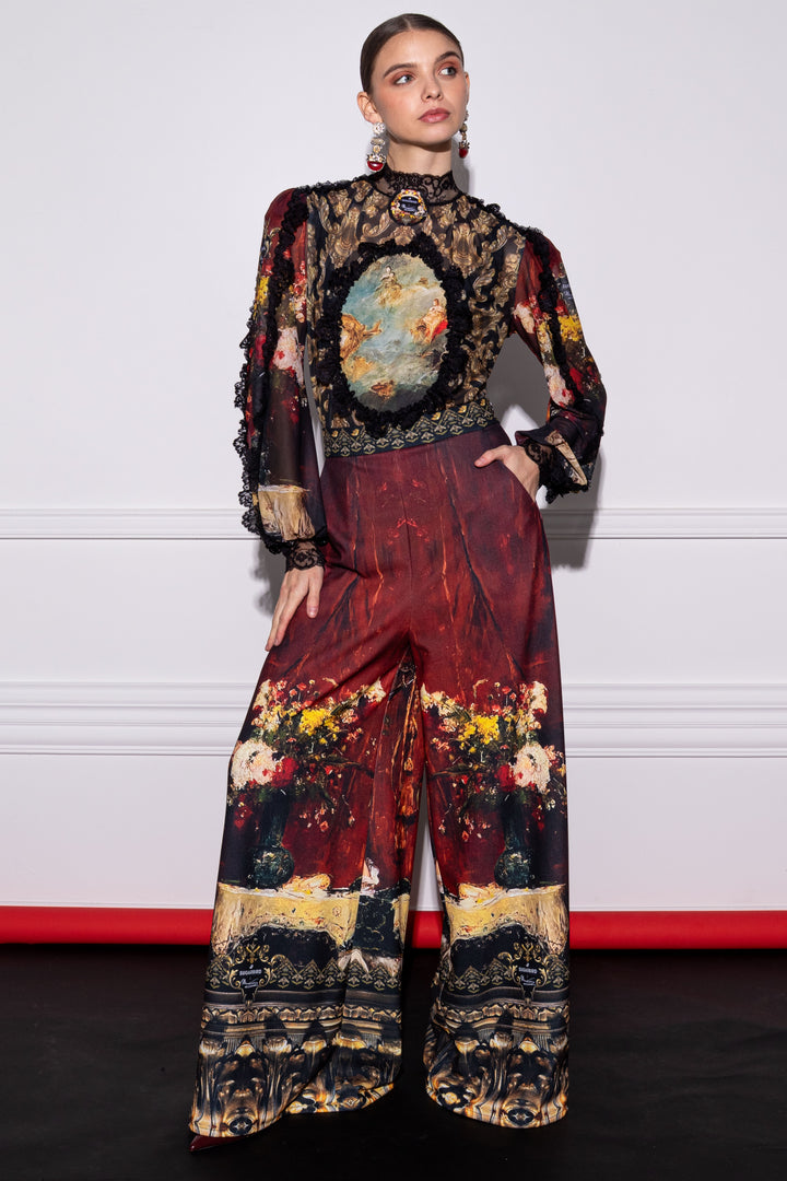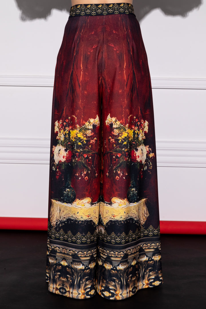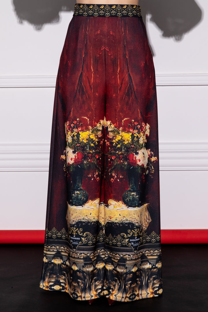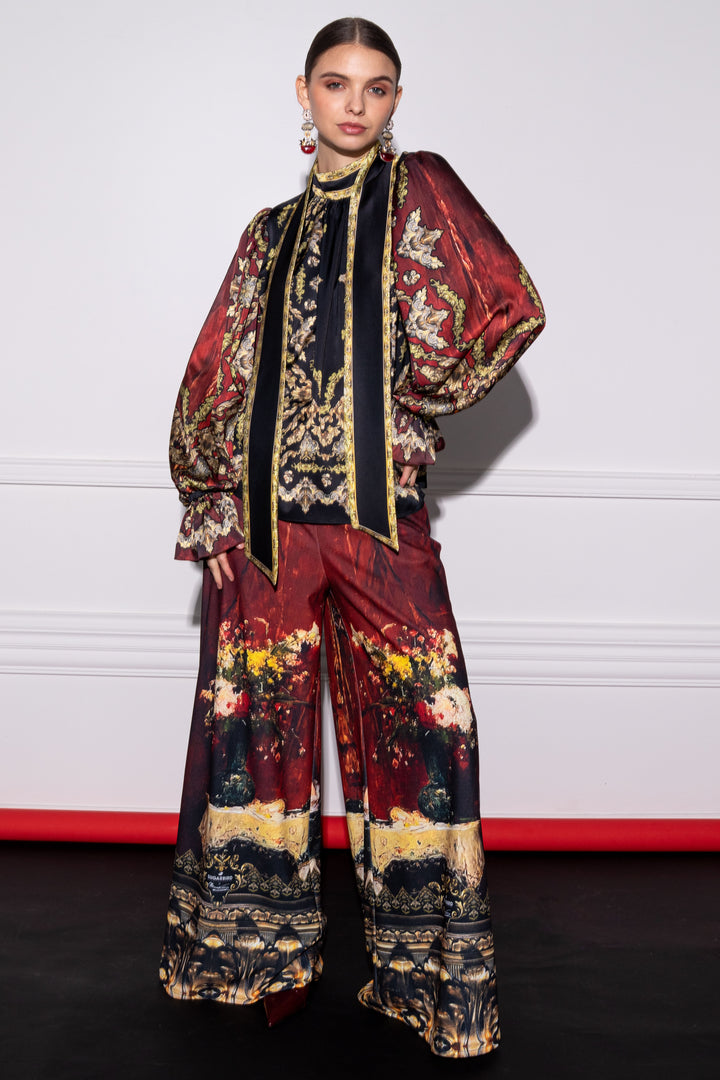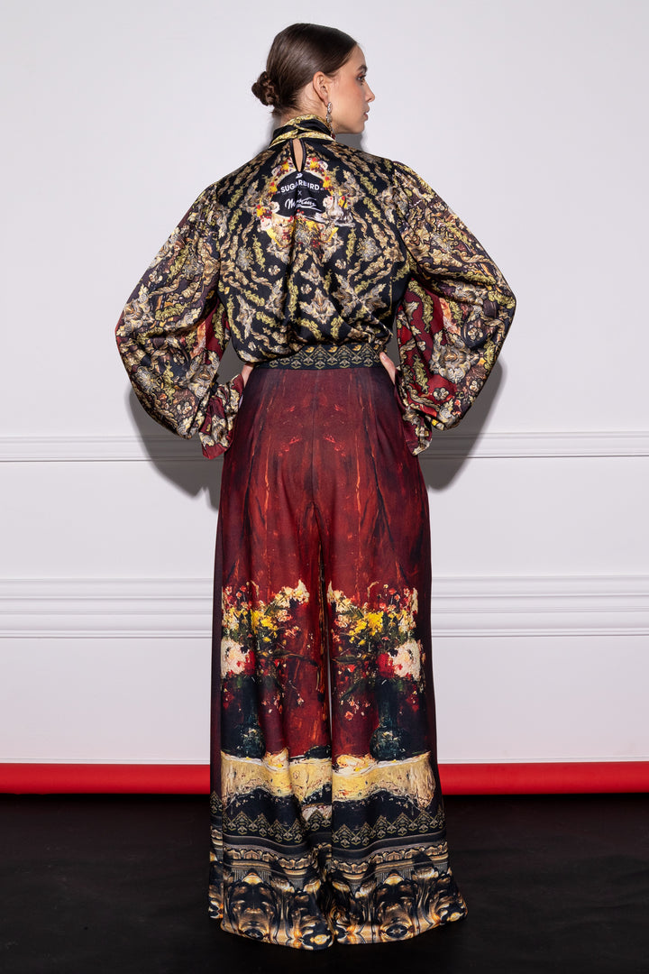 Loose and long trousers with a high waist. Side pockets and a zipper on the left side. The waist is cinched with a folded waistband.