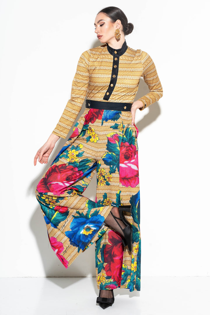 Hosszú és bő szárú, magas derekú nadrág. Háta közepén zipzárral nyitható, derékpántja az elején két arany színű gombbal díszített. A bal zsebhez SUGARBIRD feliratú címkét varrtunk.