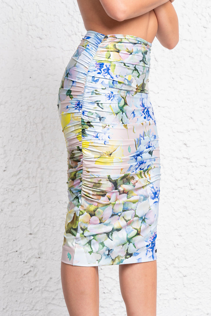 Below-the-knee, form-fitting, lined skirt. Gathered at the sides. Decorated with a SUGARBIRD label at the bottom of the left front.